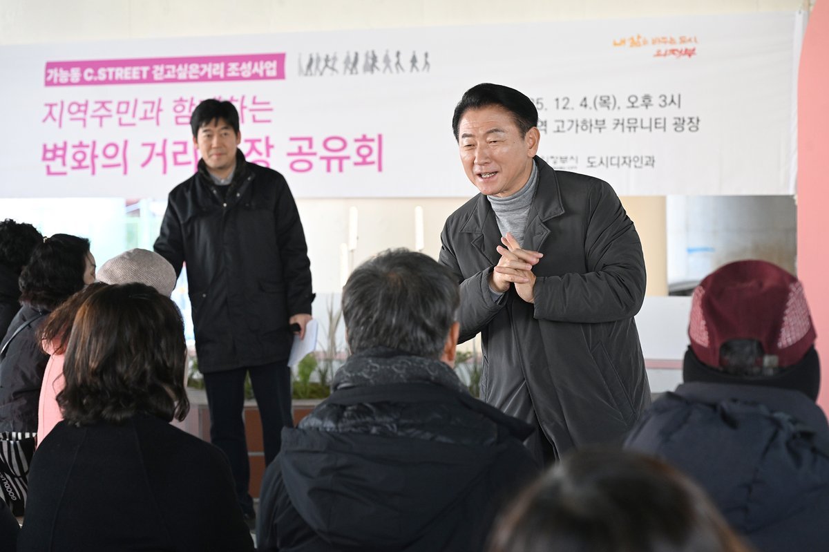 사진 설명 1~2번: 김동근 시장이 12월 4일 가능역 고가하부 커뮤니티 조성 공간에서 ‘지역주민과 함께하는 변화의 거리 현장 공유회’를 진행하고 있다.