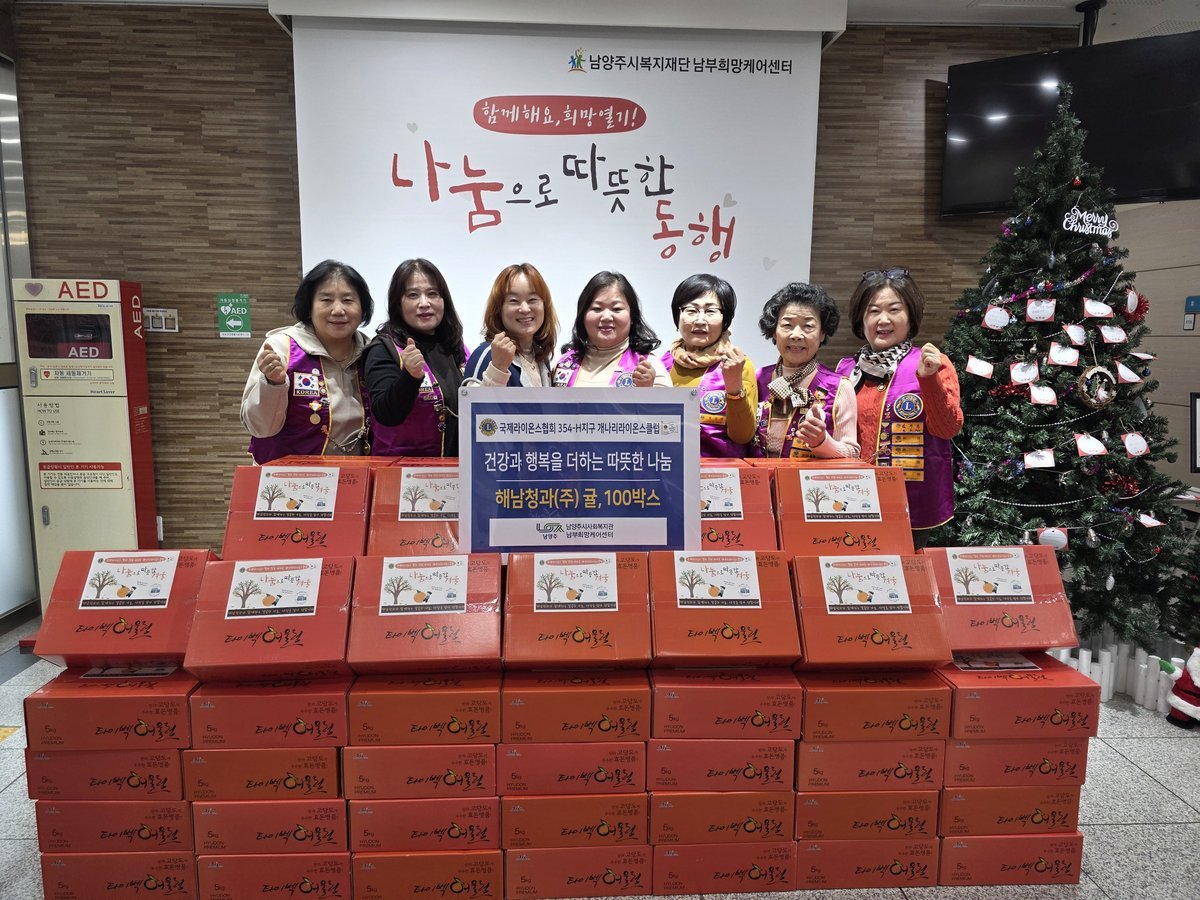 [금요저널] 남양주시는 12월 2일 국제라이온스협회 354-H지구 개나리라이온스클럽이 지역 내 복지취약가정을 위해 5kg 귤 100박스를 남양주시 남부희망케어센터에 후원했다고 밝혔다.