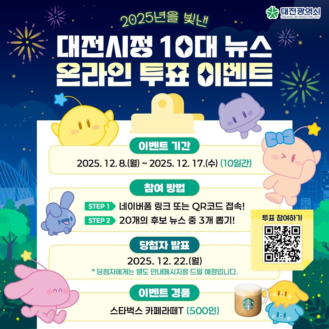 [금요저널] 대전시는 2025년 시정 성과 가운데 시민들의 공감을 얻은 뉴스를 선정하기 위해 8일부터 17일까지 ‘2025년을 빛낸 대전시정 10대 뉴스’투표를 진행한다.