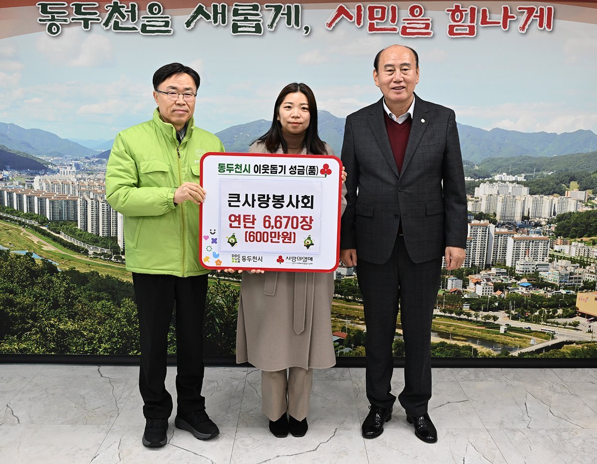 [금요저널] 큰사랑봉사회는 지난 12월 5일 동두천시청을 방문해 지역 내 에너지 취약계층을 지원하고자 연탄 6670장을 기탁했다.
