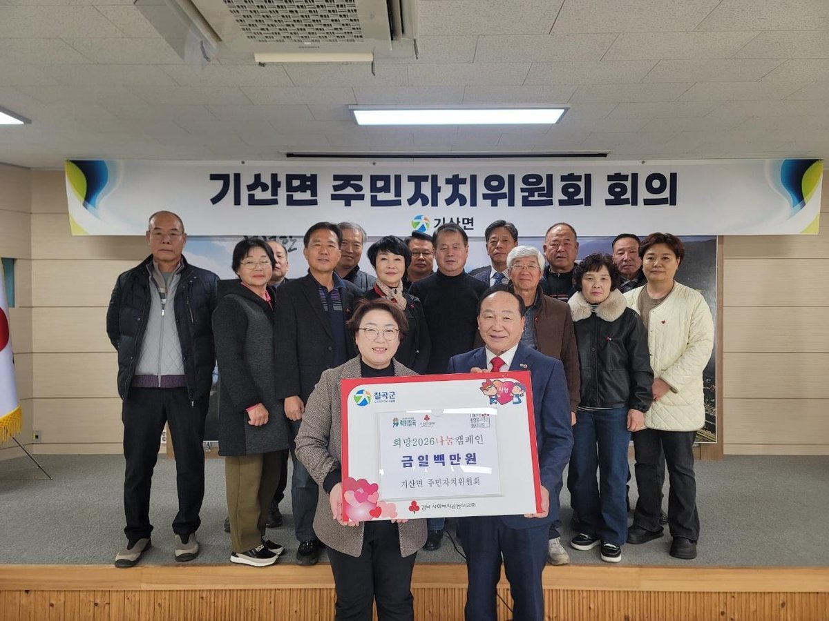 [금요저널] 칠곡군 기산면은 기산면 주민자치위원회가 ‘희망2026 나눔캠페인’의 취지에 동참하고자 성금 100만 원을 기탁했다고 4일 밝혔다.
