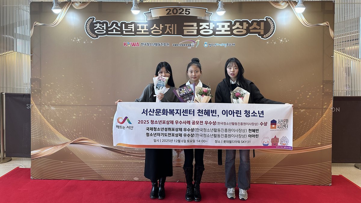 [금요저널] 2025년 서산문화복지센터 청소년포상제의 빛났던 노력의 결과 -서산문화복지센터 청소년수련관은 지난 12월 6일 롯데월드타워 SKY31컨벤션에서 열린 ‘2025년 청소년포상제 금장 포상식’에서 센터 소속 청소년 2명이 우수사례 공모전 우수상을 수상했다고 밝혔다.