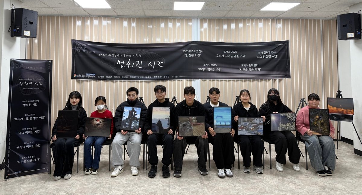 [금요저널] 시흥시청소년재단 매화청소년문화센터 사진동아리 ‘포커스’가 지난 11월 26일부터 12월 6일까지 가온누리실에서 진행한 사진전 ‘멈춰진 시간’을 열었다. 이번 전시는 청소년들이 한 해 동안 촬영한 사진을 기반으로, 일상의 흐름 속에서 놓치기 쉬운 감정ㆍ풍경ㆍ사람의 모습을 고요하게 붙잡아 둔다는 의미를 담아 기획됐다.