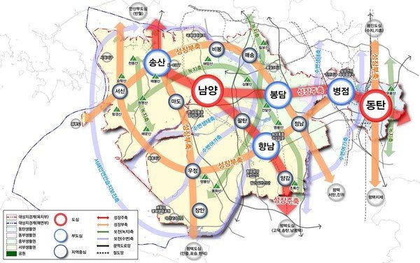 ‘2도심’은 남양과 동탄으로, 주요 도시 기능을 담당하는 시청이 위치한 행정 거점 ‘남양’과 경제ㆍ산업ㆍ교통 등 시의 전반적인 경제성장을 견인하는 ‘동탄’으로 설정됐다.