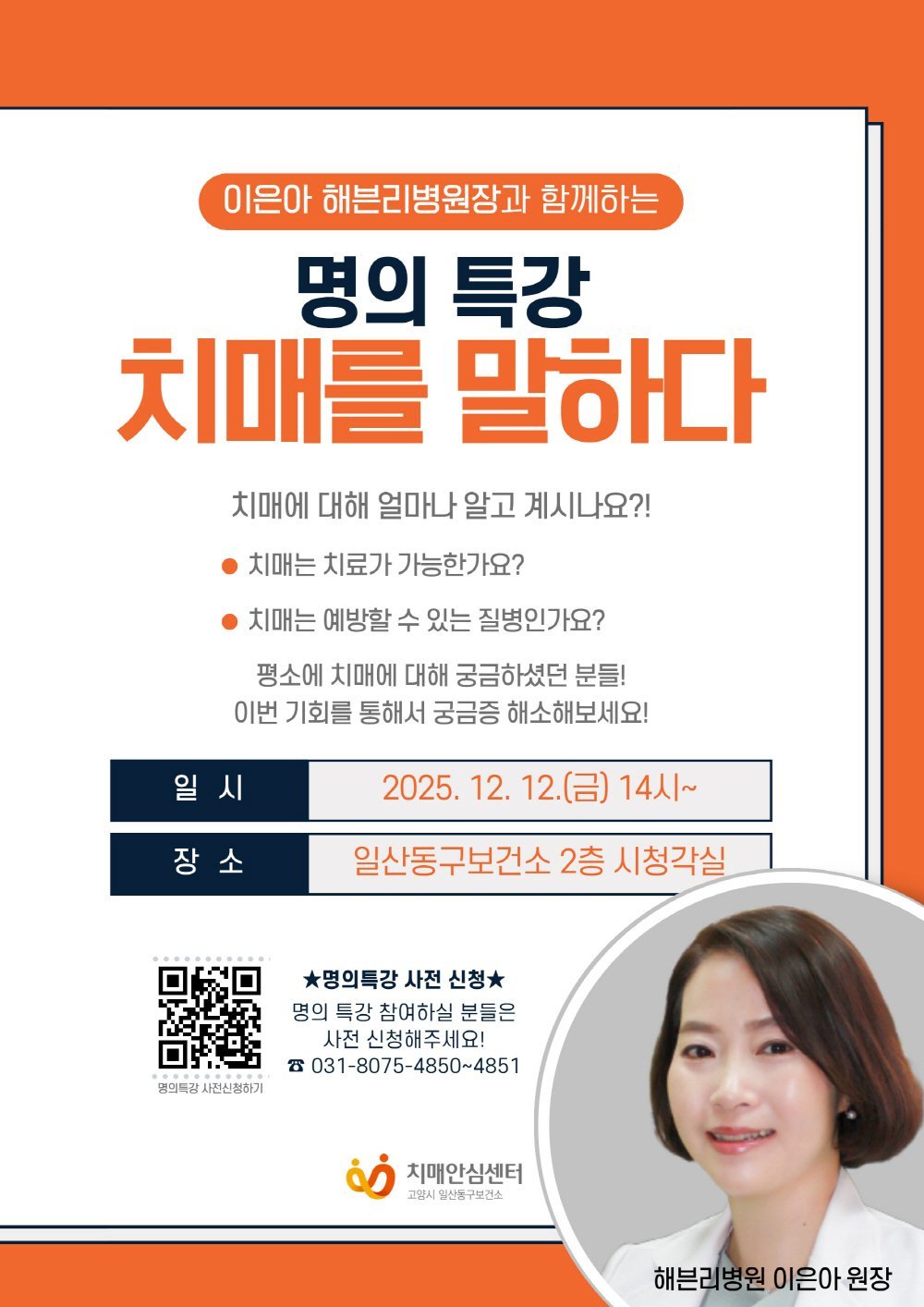 이번 명의 특강 ‘치매를 말하다’는 12일, 일산동구보건소 시청각실에서 14시부터 진행되며, 사전 접수를 통해 참가 신청을 받는다.