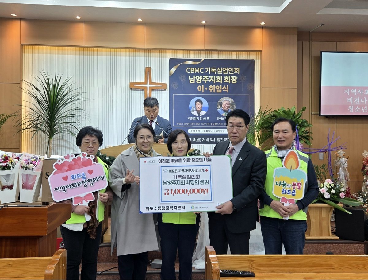 [금요저널] 남양주시는 지난 8일 한국기독실업인회 남양주지회가 지회장 이·취임식을 기념해 화도읍 지역사회보장협의체에 후원금 100만 원을 지정 기탁했다고 밝혔다.