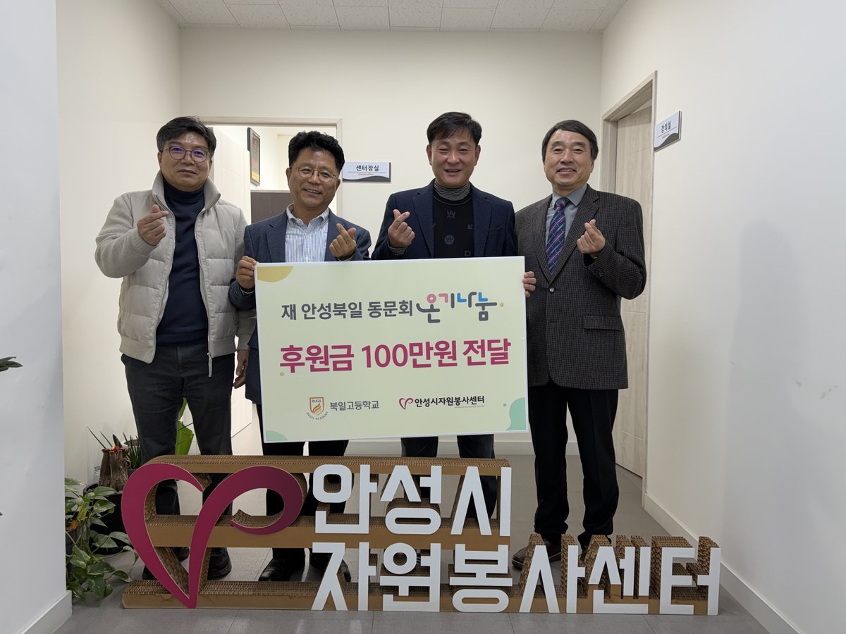 이날 안성시자원봉사센터에서 진행된 후원금 전달식은 동문회가 지역사회에 따뜻한 연말 온정을 나누고 복지 사각지대에 놓인 이웃들을 돕기 위해 마련되었으며, 동문들은 십시일반 후원금을 모아 따뜻한 마음을 전했다.