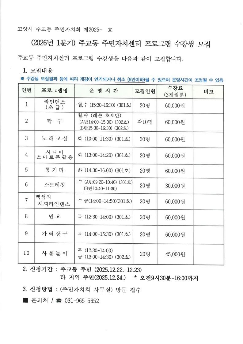 [금요저널] 고양특례시 덕양구 주교동 주민자치회는 오는 12월 22일부터 24일까지 2026년 1분기 주민자치센터 문화강좌 프로그램 수강생을 모집한다.
