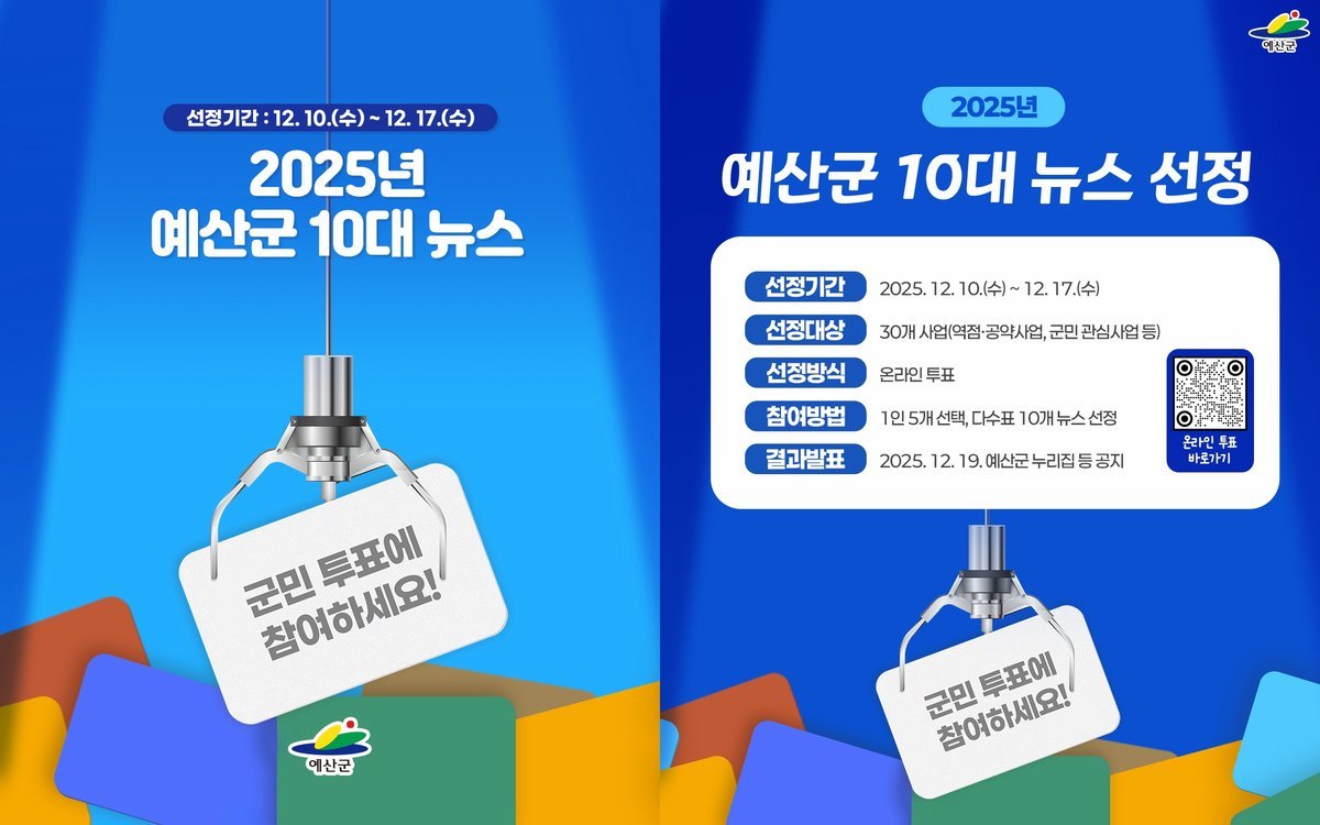 [금요저널] 예산군은 2025년 한 해를 빛낸 주요 성과를 군민과 직원의 투표를 통해 선정하기 위해 ‘2025년 예산군 10대 뉴스 선정’을 추진한다고 밝혔다.