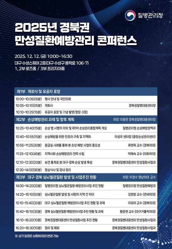 [금요저널] 질병관리청 경북권질병대응센터는 12월 12일 10시 대구 수성스퀘어에서 지역사회 만성질환 관리 협력체계 강화를 위한 「2025년 경북권 만성질환예방관리 콘퍼런스」를 개최*한다.