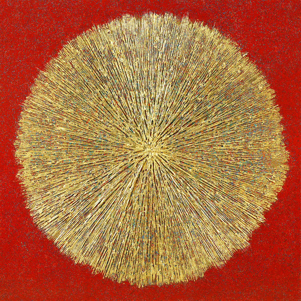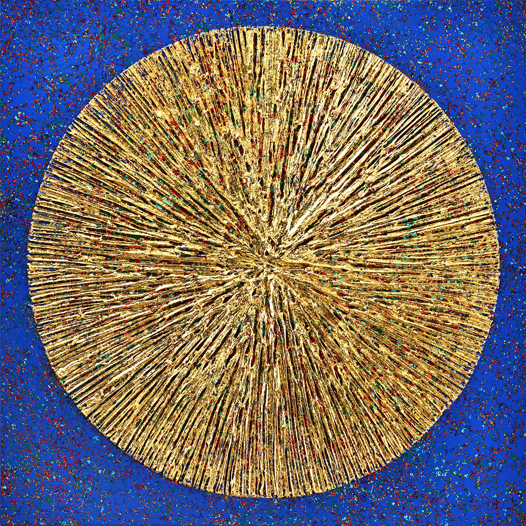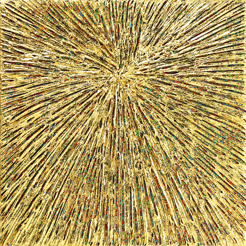 이러한 표현은 작업 과정에서도 이어진다. 초박형 24K 순금 금박을 캔버스 위에 수십 차례 두드리고, 붙이고, 긁어내는 행위는 단순한 물리적 노동을 넘어 하나의 의식(ritual)에 가까운 과정이다. 금을 쌓고, 색을 축적하고, 다시 덮고 지우는 시간이 반복되며, 작품은 마치 하나의 우주가 탄생하는 순간처럼 완성된다.