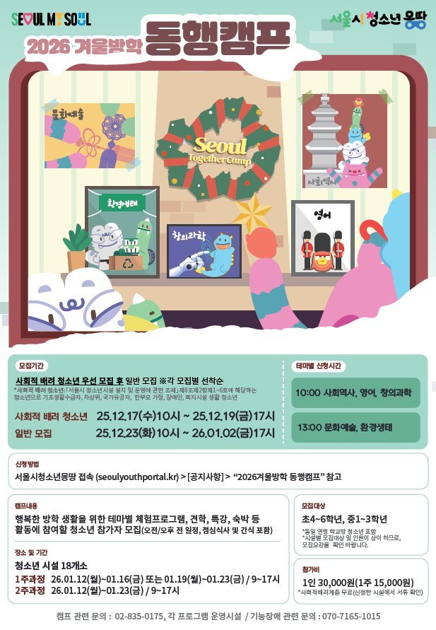 [금요저널] 서울시가 다가오는 겨울방학을 맞아 청소년들의 돌봄 공백을 해소하고 진로 탐색의 기회를 제공하는 ‘서울시 청소년 동행캠프’를 추진한다고 밝혔다. 이번 캠프는 2026년 1월 12일부터 23일까지 2주간 서울시립청소년시설 24개소에서 진행된다.