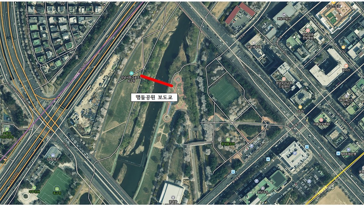 이번 보도교는 백현동 3단지 앞 성남시 파크골프장 B구장 지점과 수내동 맴돌공원 물놀이장 지점을 동서로 연결한다.