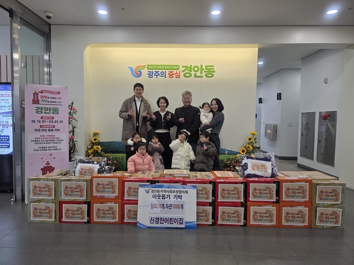 [금요저널] 신경안어린이집은 지난 15일 광주시 경안동 지역사회보장협의체에 어린이집 행사 수익금으로 마련한 무릎 담요 50개와 라면 1천 개를 전달했다.