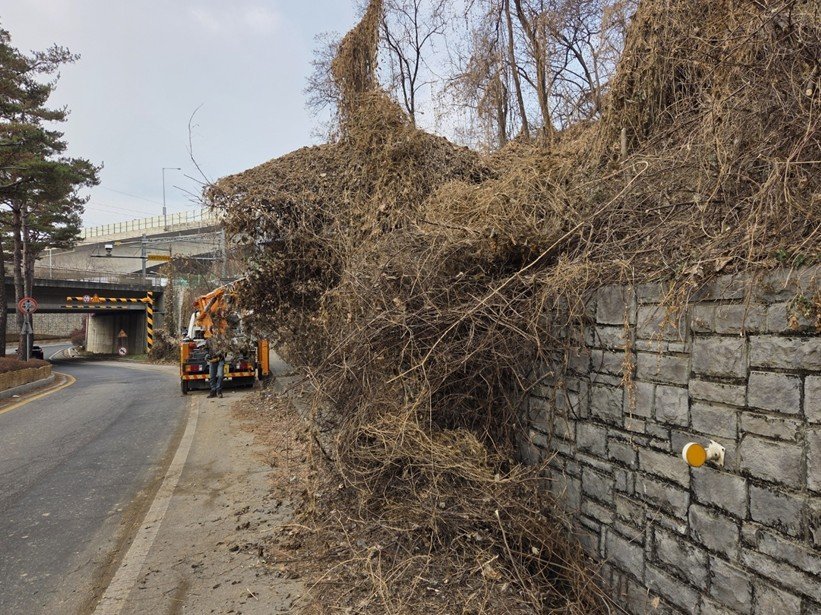 이번 작업은 차량 통행이 많은 도로변에서 급속히 확산 중인 가시박으로부터 지역 생태계를 보호하고, 운전자 시야 확보와 안전사고 예방을 위한 조치로 추진됐다.